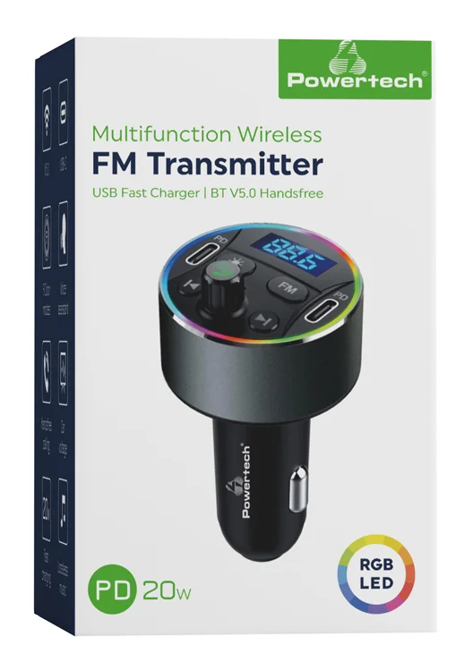 Ο FM Transmitter της Powertech επιτρέπει την ασύρματη μετάδοση ήχου από τη συσκευή σας προς το ραδιόφωνο του αυτοκινήτου. Είναι ιδανικό για αυτοκίνητα που δεν έχουν players με δυνατότητα αναπαραγωγής MP3 αρχείων. Υποστηρίζει αναπαραγωγή μέσω Bluetooth και διαθέτει οθόνη και δύο PD USB-C θύρες για φόρτιση συσκευών.